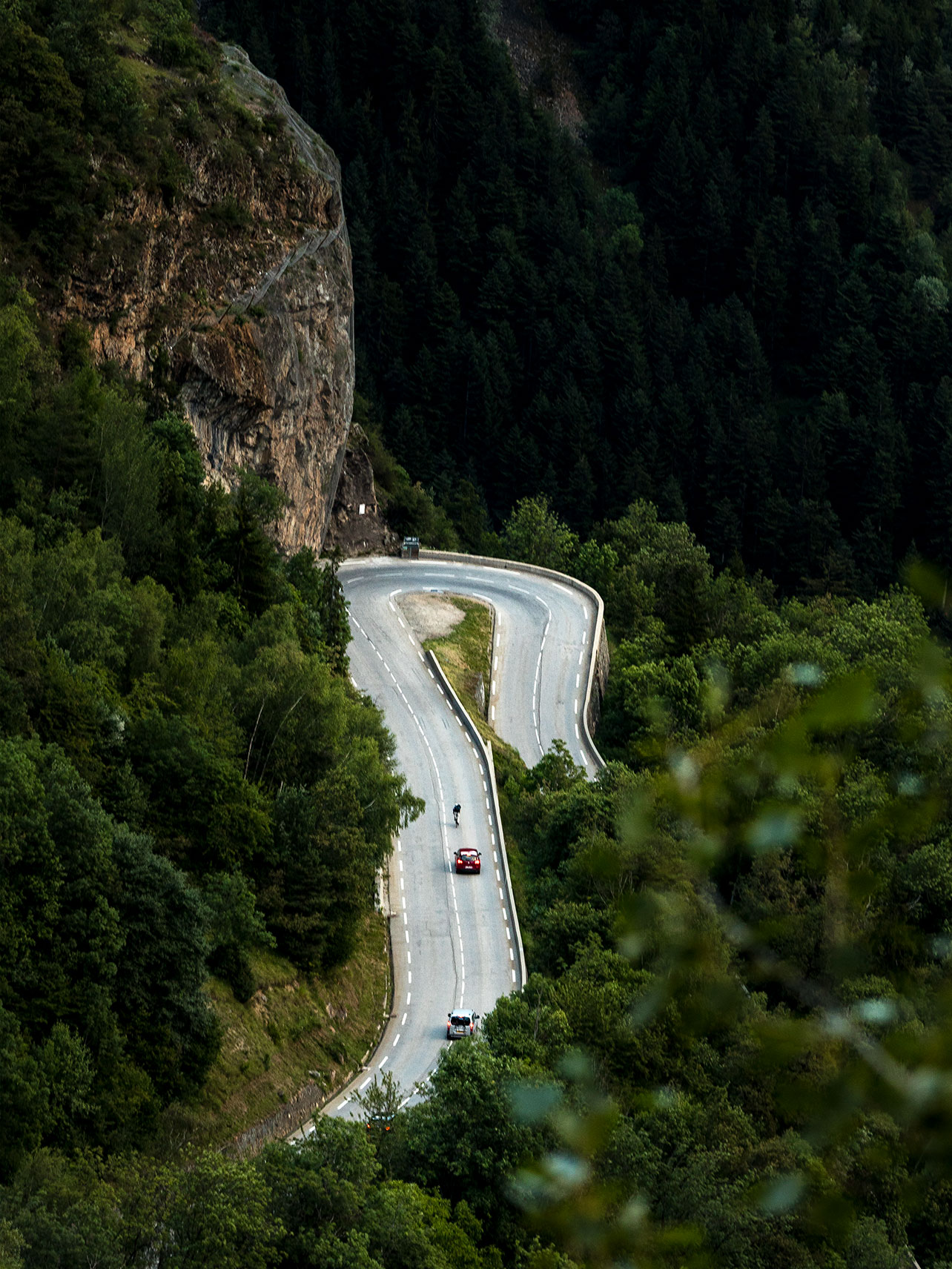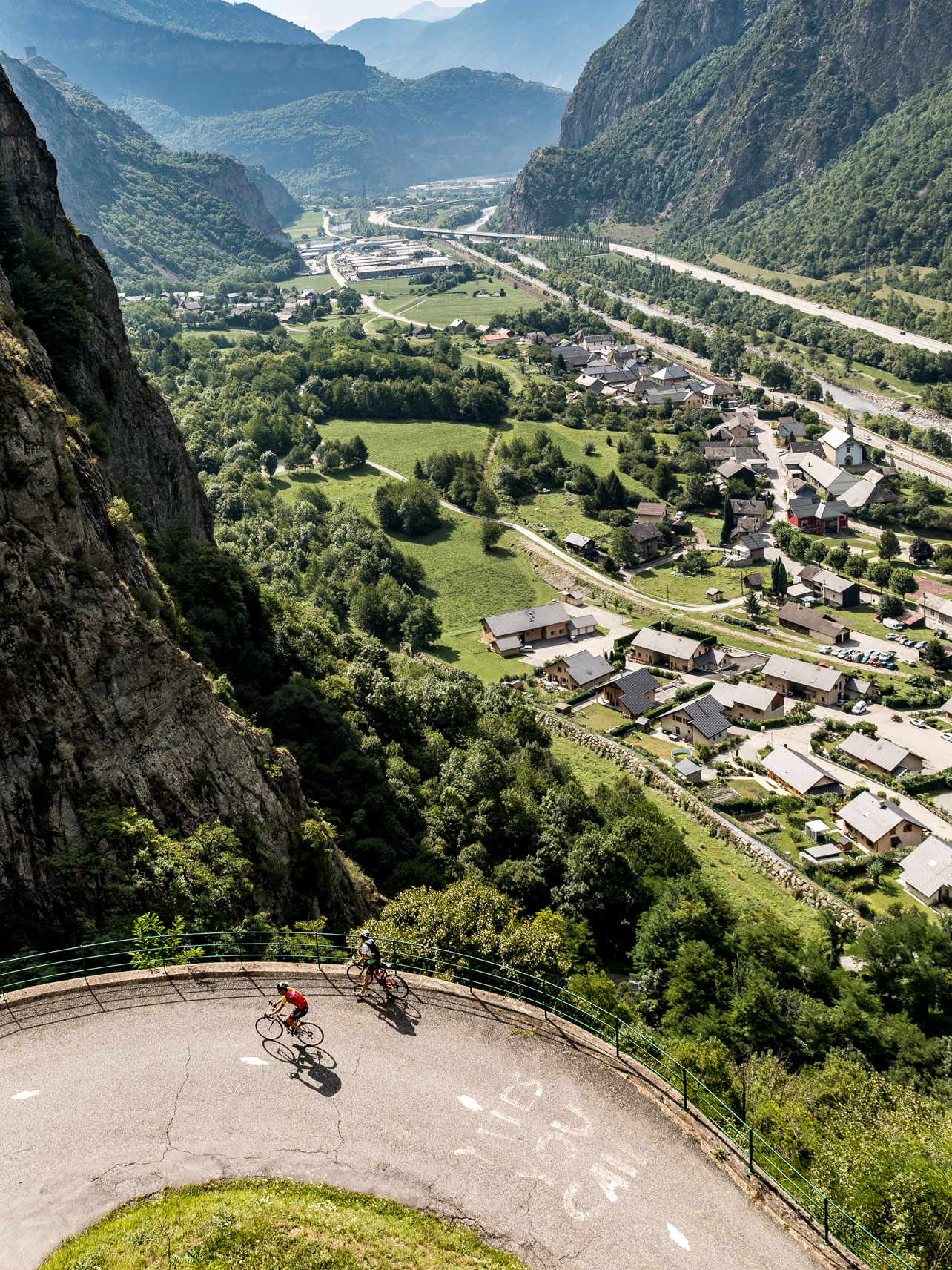 The region around Bourg d’Oisans has more to offer than just the well-known and prestigious climbs. It’s also worth exploring the smaller routes, away from the hustle and bustle. In our case, this tour led us to the legendary hairpin bends of Alpe d’Huez. But the real highlight was a balcony road cut right into the side of the cliffs high up over the valley. Luckily there was hardly any traffic on this vertigo-inducing little road, which is barely wide enough for two cars to pass each other. As a result, we could really let the magnificent views work their magic on us in peace.
