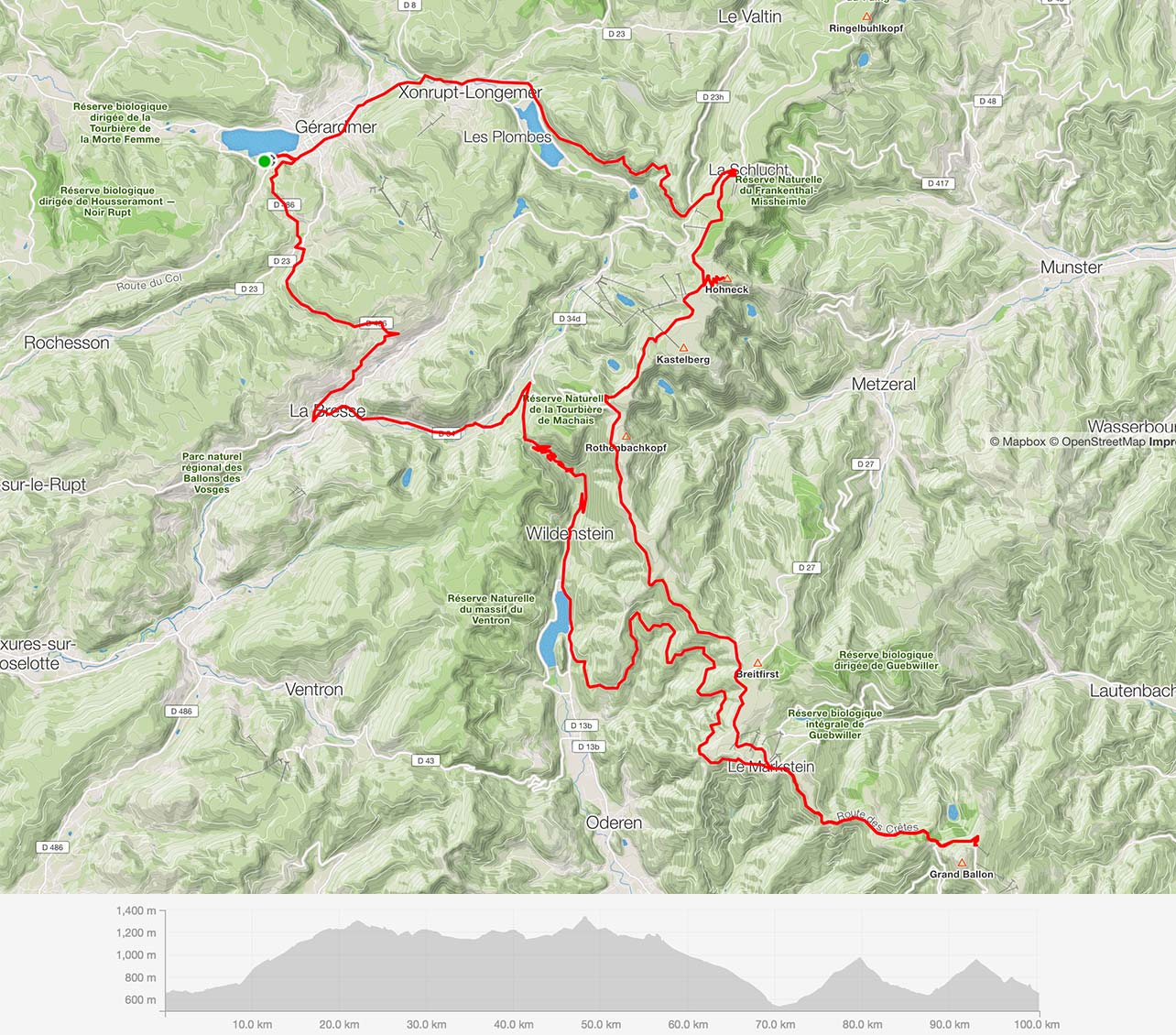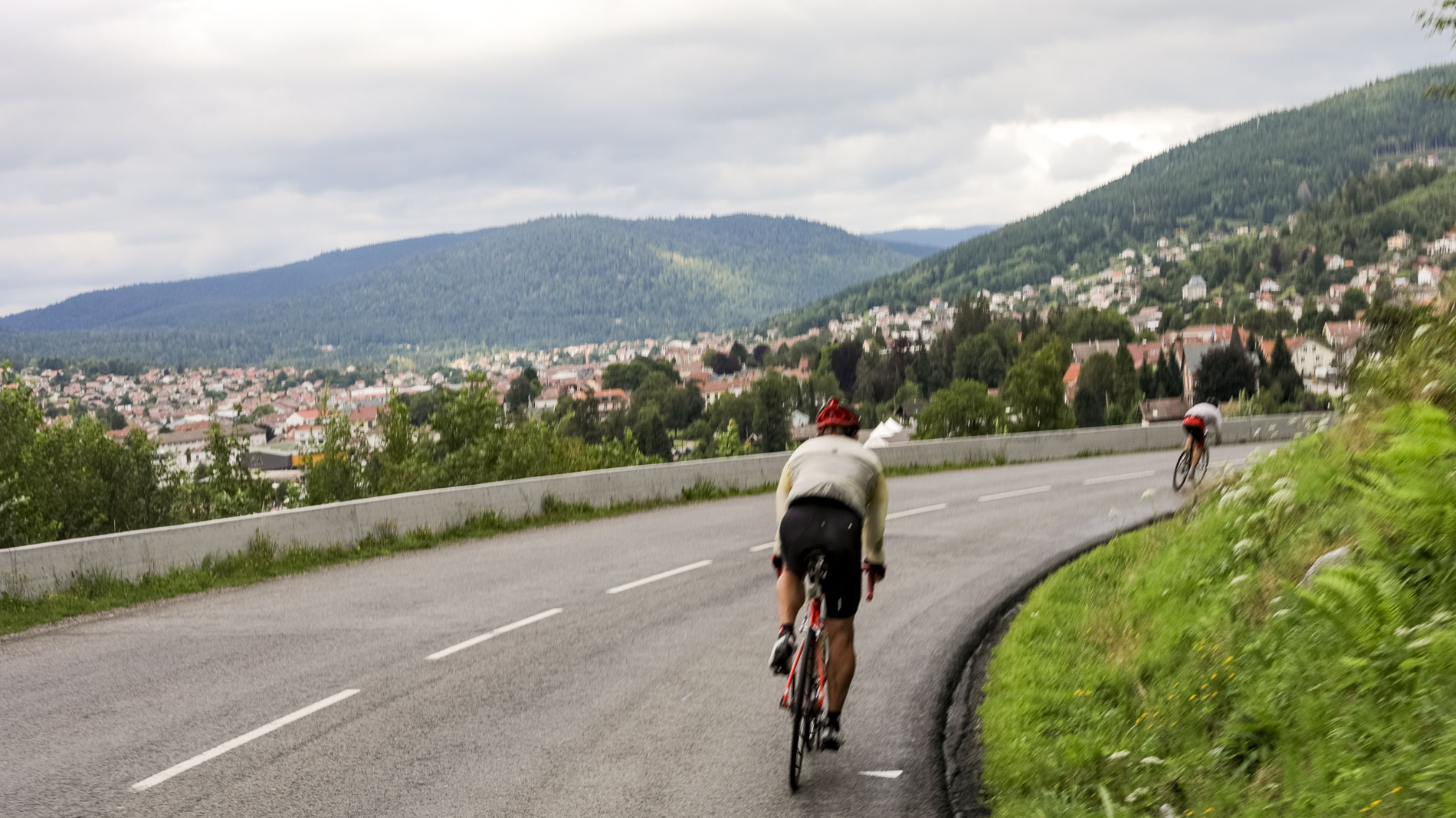 After 100 sweat-producing kilometers, it was all downhill at the end. Exhausted but elated, we flew along the final bends down into the valley to Gérardmer.