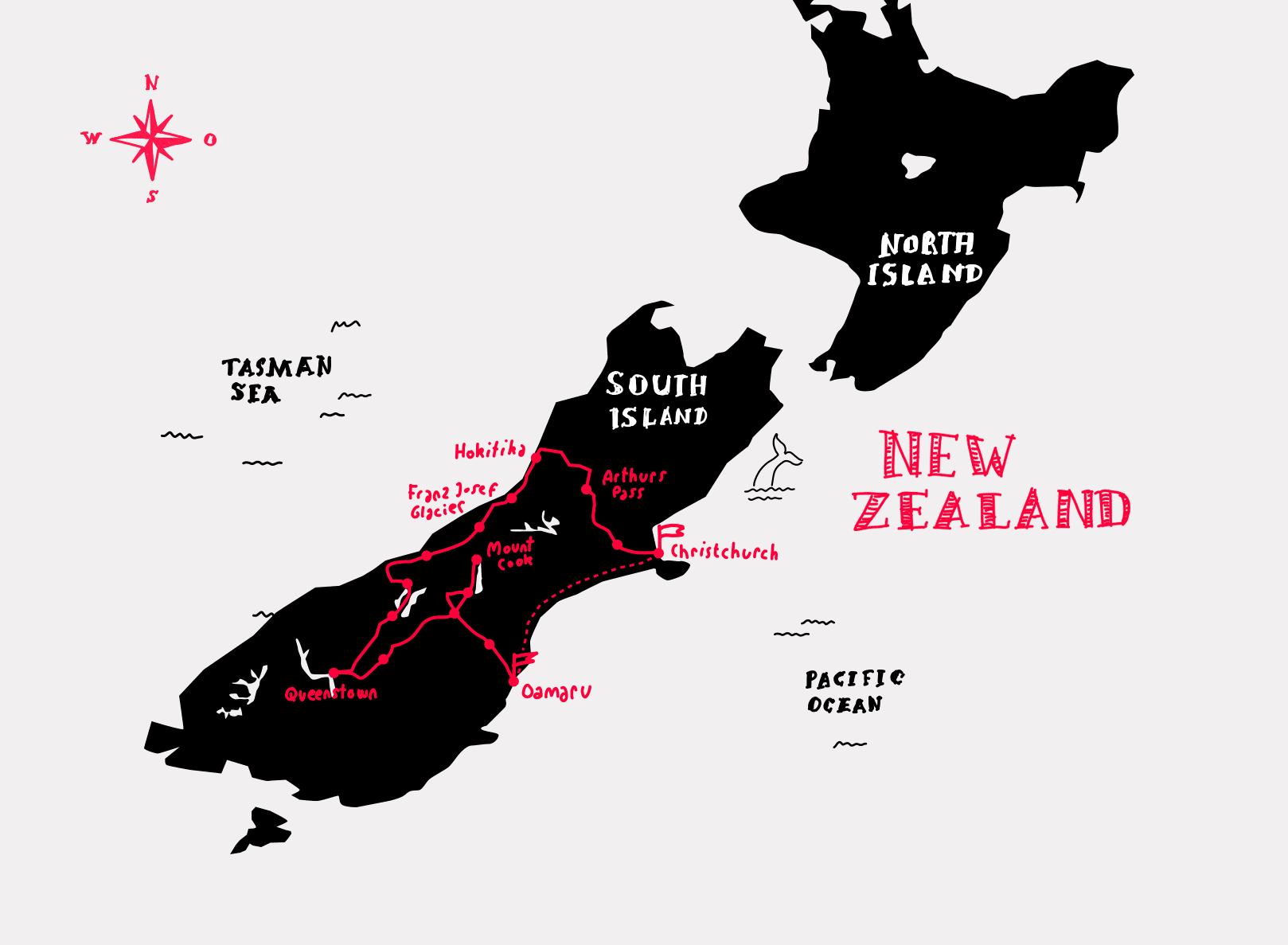 TRAVEL ROUTE: Christchurch • Springfield • Arthur’s Pass • Hokitika • Hari Hari • Franz Josef Glacier • Lake Moeraki • Makarora • Te Wanaka • Queenstown • Cromwell • Omarama • Mt. Cook Village • Twizel • Omarama • Kurow • Oamaru