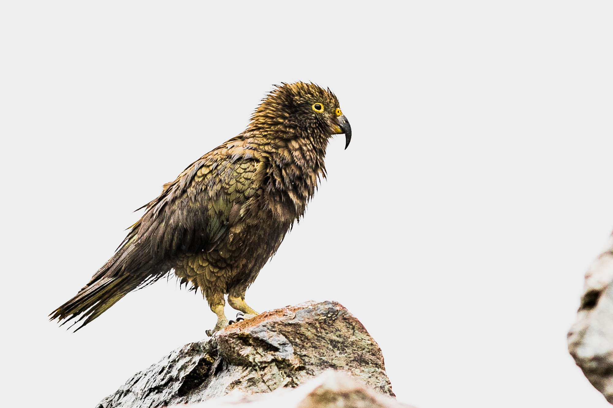 A drenched kea in Aoraki/Mount Cook National Park